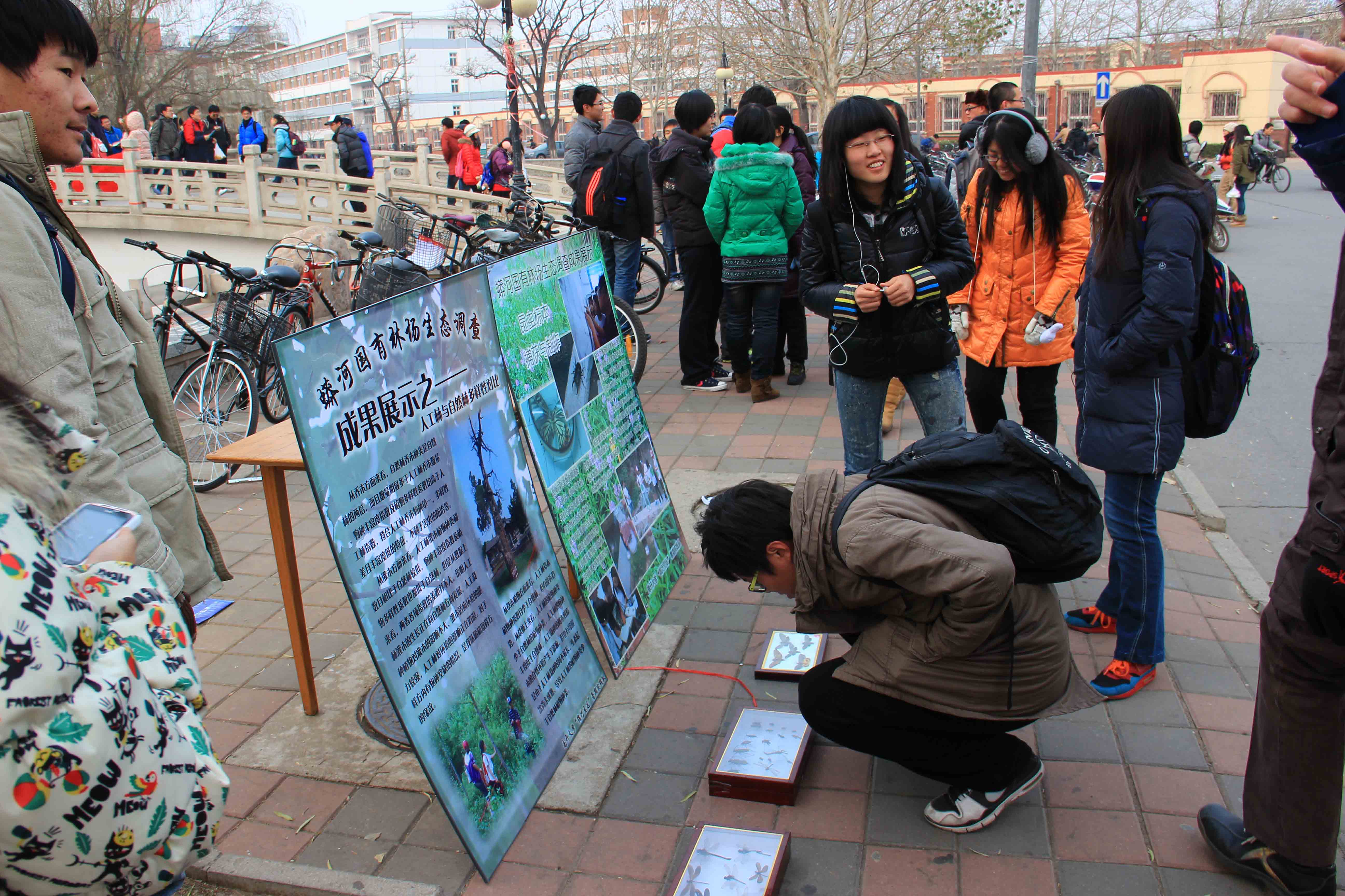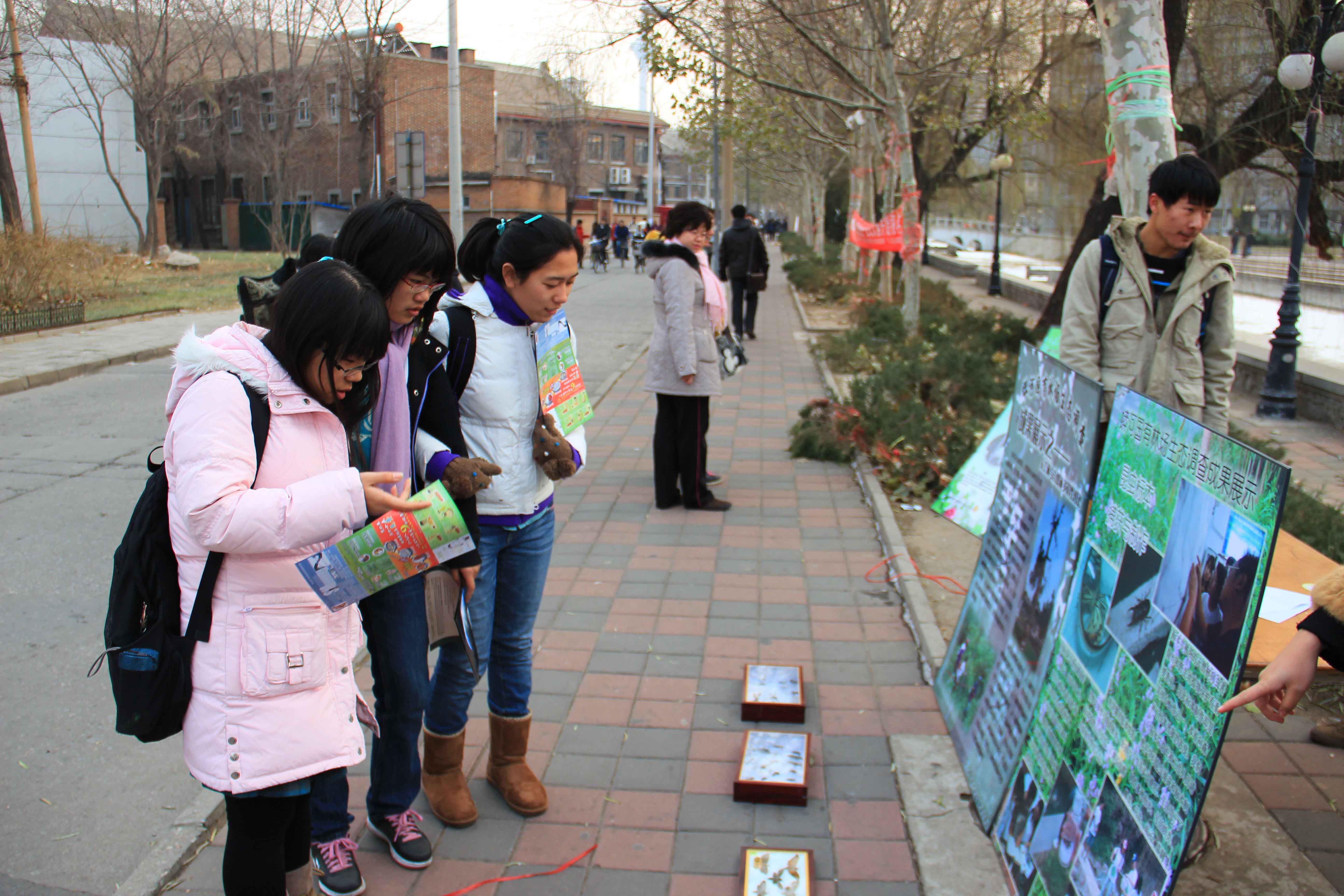 暑期实践队同学结合展板和昆虫标本,生动介绍了以下四方面内容:林场标本馆实践基地建立和昆虫标本捕获与制作,人工林与天然林生态多样性调查成果,林场中新农村建设调查主要内容以及队员的感想感言。在瑟瑟寒风中,在茫茫冬日里,绿色的展板、精美的标本、动人的解说仿佛给校园带来一缕清风,一股充满生机的气息。