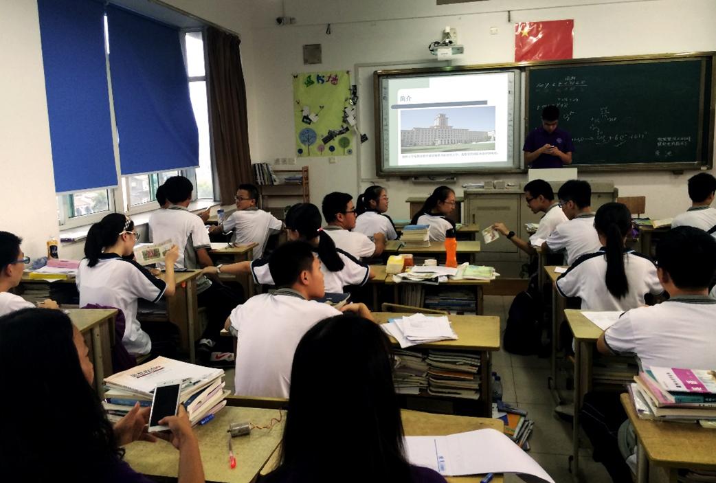然后,社会实践队成员吕功成同学上台发表演讲,在温州中学为同学们详细介绍william威廉中文官网的校园风貌、人文风貌和院系设置,宣传william威廉中文官网的师资力量与丰富的馆藏资源,尤其在数学方面建造的陈省身数学研究所以及其他学科的国家级重点实验室等得天独厚的优越条件。