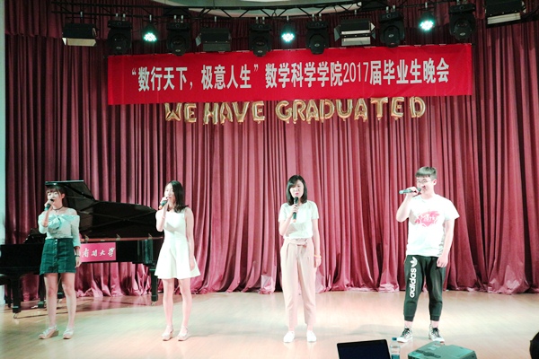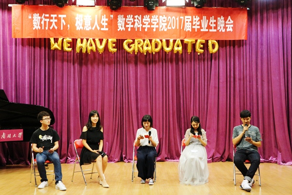 晚会在献给2017届全体数院毕业生的开场视频中拉开了帷幕,从入学初的军训到不久前的毕业合影,视频里的每一帧画面都给同学们留下了美好回忆;活力四射的女生们用动感的舞蹈将大家从回忆的伤感中拉回现场,点燃全场气氛;学院党委副书记、副院长魏巍、辅导员李林先后致辞,阮吉寿老师、谭玉琪老师精彩献唱,都给同学们留下了满满的感动;姚智元同学的双截棍表演、刘子路和张磊同学的拉丁舞表演惊艳全场,获得掌声连连;歌曲《卫津南路的日子》《那些花儿》《夜空中最亮的星》等表达了同学们对南开生活的不舍以及对未来生活的祝愿;晚会中间更是穿插游戏互动环节和抽奖环节,同学们参与热情高涨,将晚会气氛带向高潮;结尾部分的毕业感言分享环节道出了同学们的离别心声和真挚祝福,匿名卡片里包藏了不少的惊喜与欢笑。