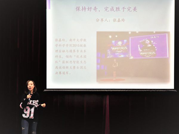 2015级数理金融与精算专业本科生张嘉玲以“保持好奇,完成胜于完美”为题,分享了她参加商业竞赛的经历。从带领实践队奔赴内蒙古进行企业调研,斩获第四届泰达创新创业大赛一等奖,到带领“优米团队”获联想智能生态高效创新大赛全国总决赛冠军,谈及创新之路,她认为青年要敢于尝试新事物,跳出自己的舒适圈,关注社会前沿资讯,努力成为交叉型人才。同时,她也提到好奇不是无意义的好奇,而是对未知领域的多尝试、多试错,在尝试中寻找兴趣所在。