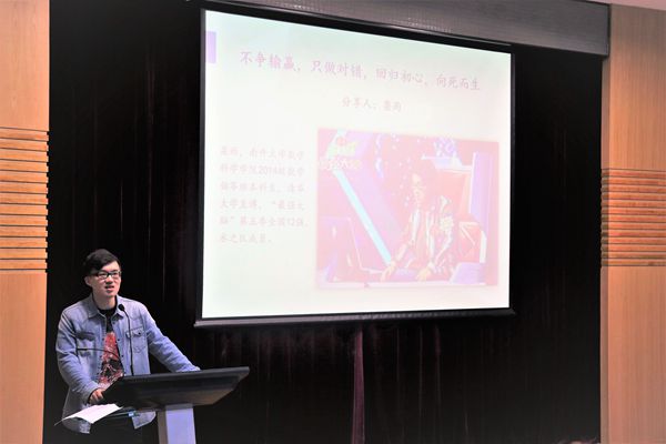 2014级数学伯苓班本科生栾雨因参加江苏卫视“最强大脑”节目而被大家熟知。在分享中,他提到参加节目的这段经历是他最大的收获。在节目中,栾雨曾一路“开挂”,获得“全能浪子”的封号,也曾败阵连连,饱受质疑。不过,生活终归平静,没有人一直站在舞台上。面对比赛结果,他坦然地说,输赢不重要,但求问心无愧,挑战与挫折恰好让自己回归初心,无论现在还是未来,都要奋力一搏。