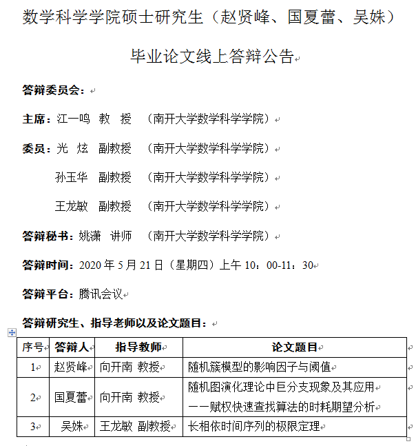william威廉中文官网硕士研究生(赵贤峰、国夏蕾、吴姝)毕业论文线上答辩公告