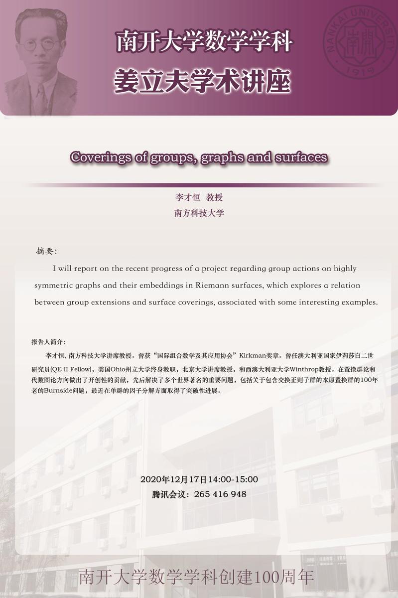 【姜立夫学术讲座】Coverings of groups,graphs and surfaces