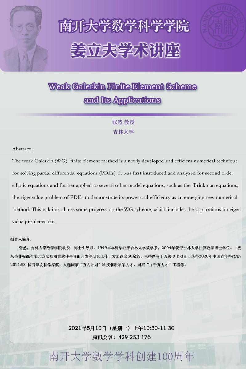 【姜立夫学术讲座】Weak Galerkin Finite Element Scheme and Its Applications