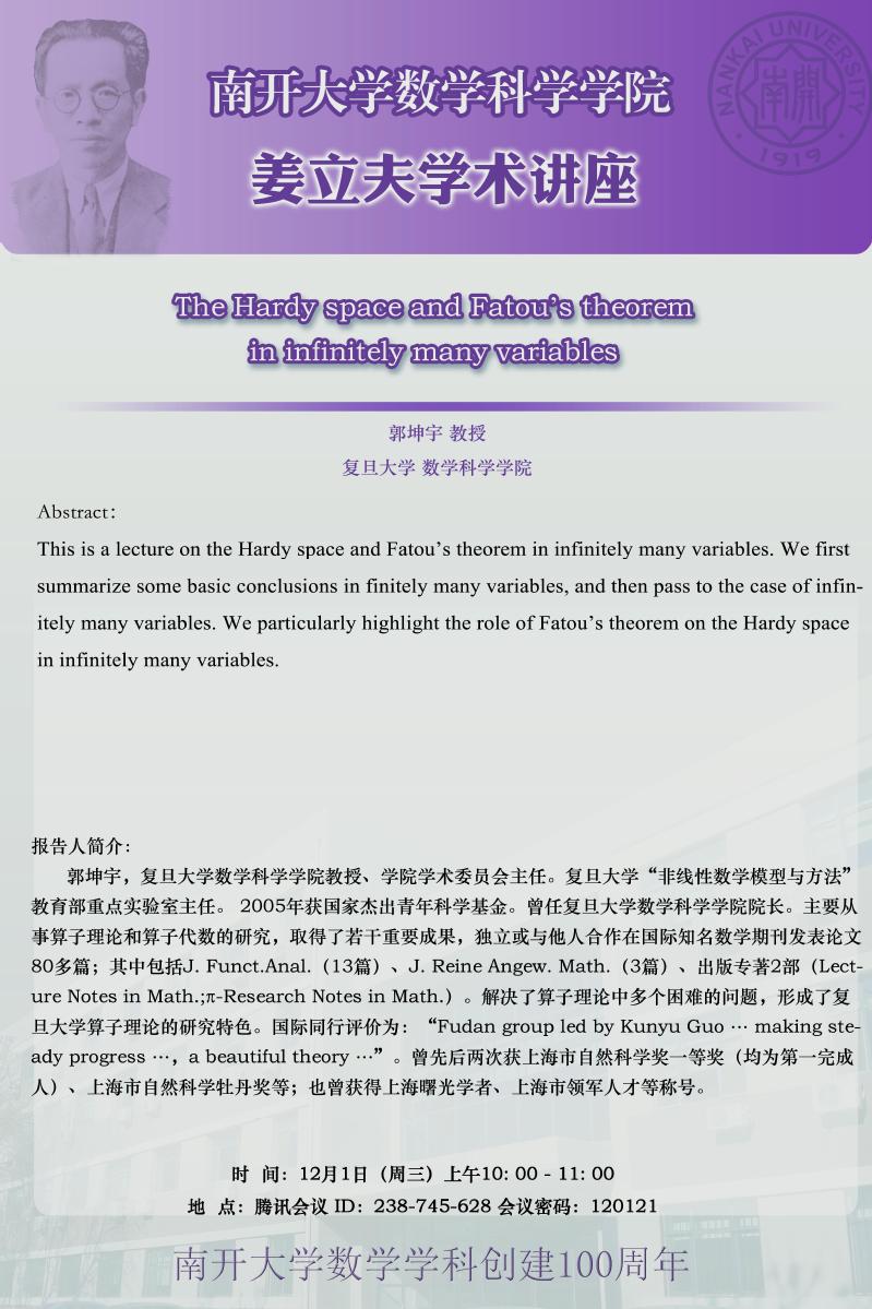 【姜立夫学术讲座】The Hardy space and Fatou’s theorem in infinitely many variables