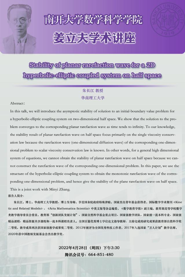 【姜立夫学术讲座】Stability of planar rarefaction wave for a 2D hyperbolic-elliptic coupled system on half space