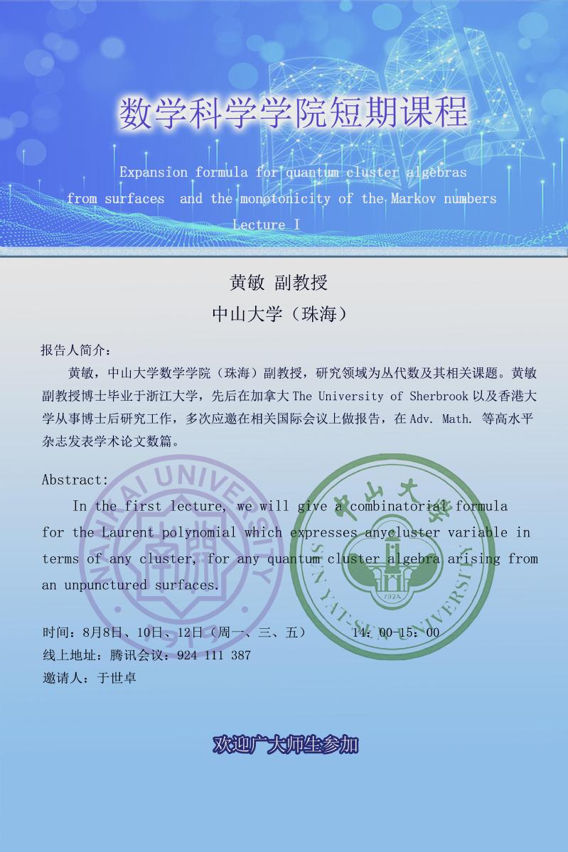 Expansion formula for quantum cluster algebras from surfaces and momnotonicity of the Markov numbers (Lecture I)