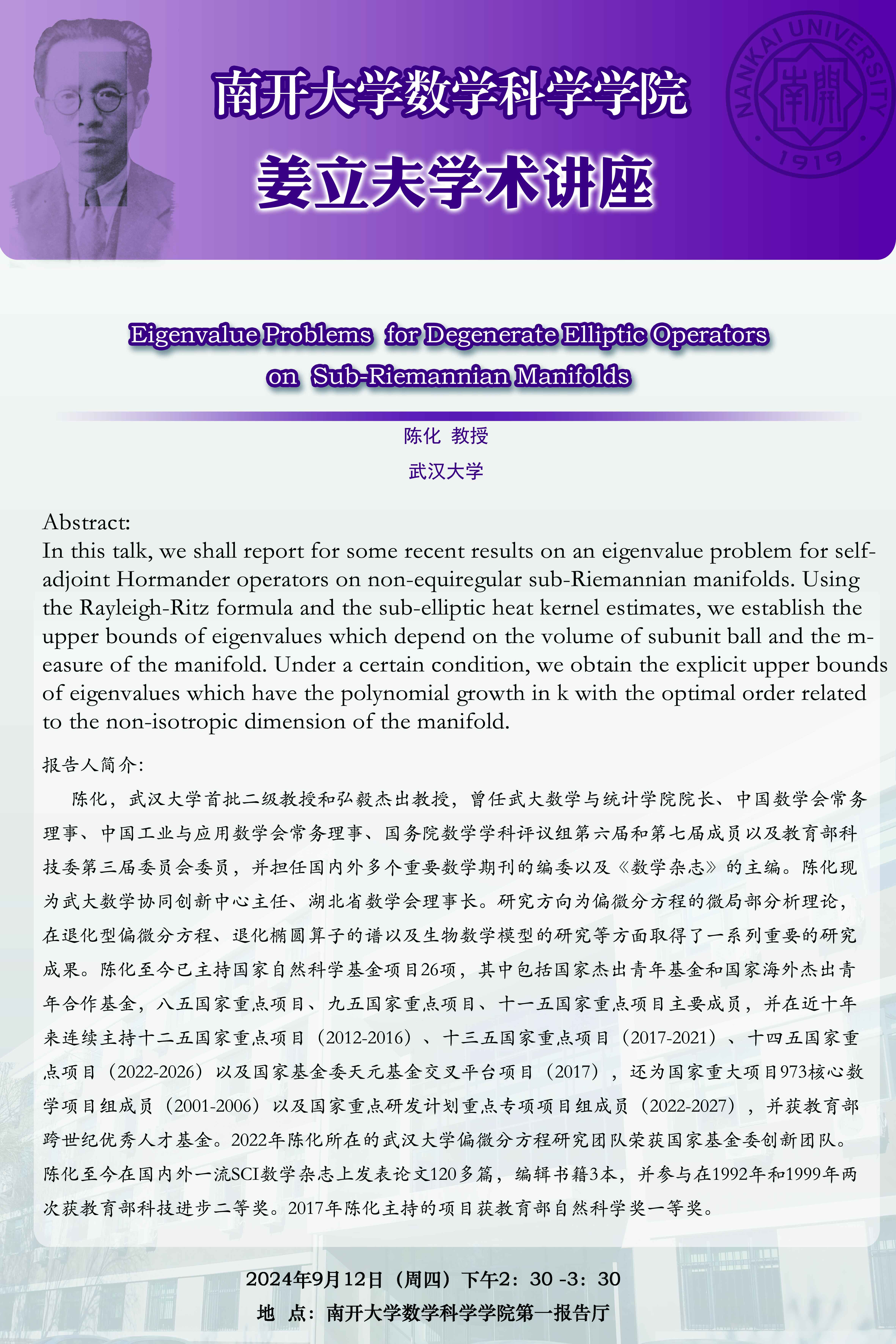【姜立夫学术讲座】Eigenvalue Problems for Degenerate Elliptic Operators on Sub-Riemannian Manifolds