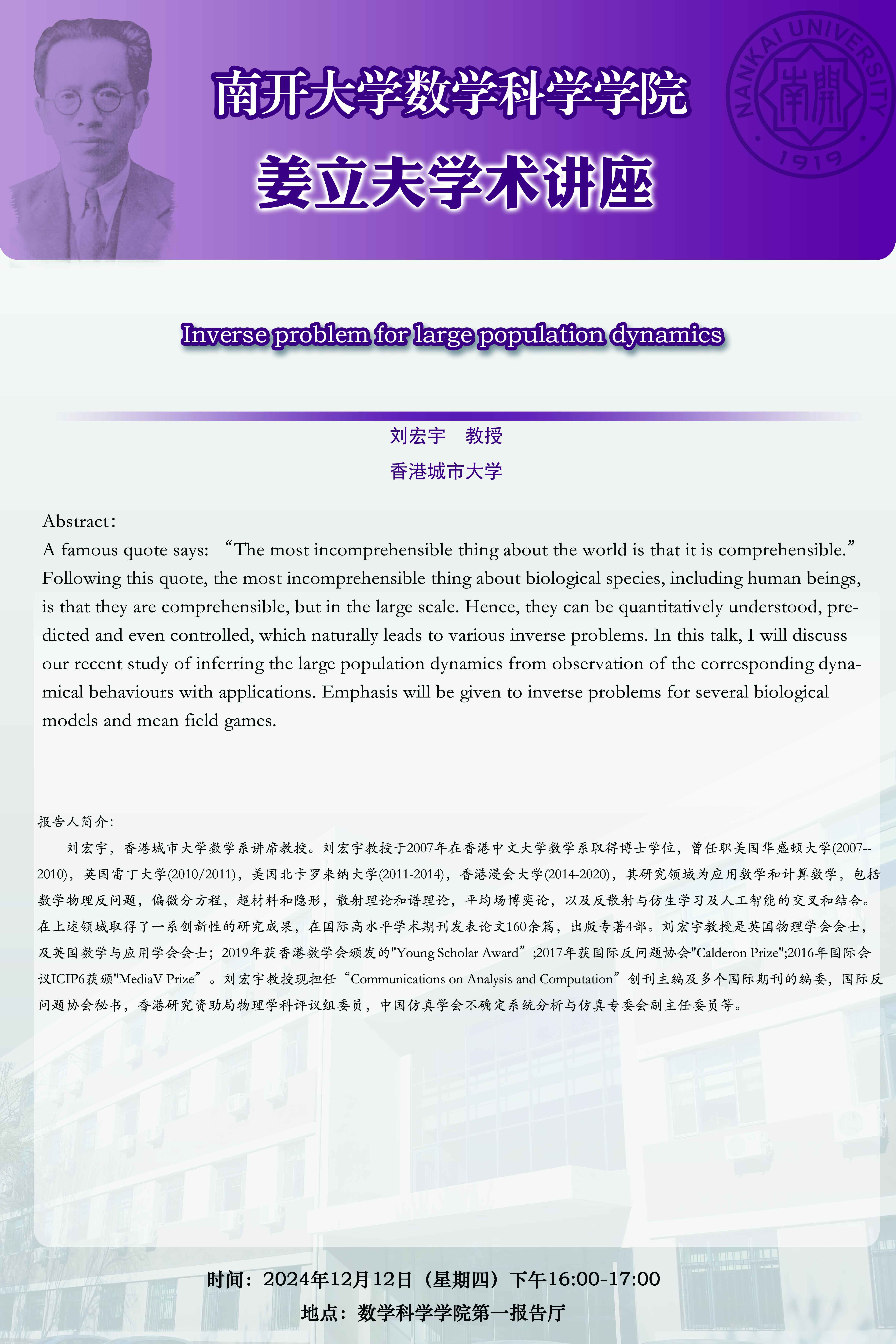 【姜立夫学术讲座】Inverse problem for large population dynamics