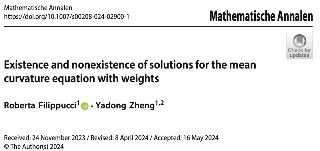 近日,我院 2020 级博士生郑亚东在联合培养期间与意大利佩鲁贾大学 R. Filippucci 教授合作在Mathematische Annalen (德国数学年刊) 上发表了题为 “Existence and nonexistence of solutions for the mean curvature equation with weights” 的学术论文。