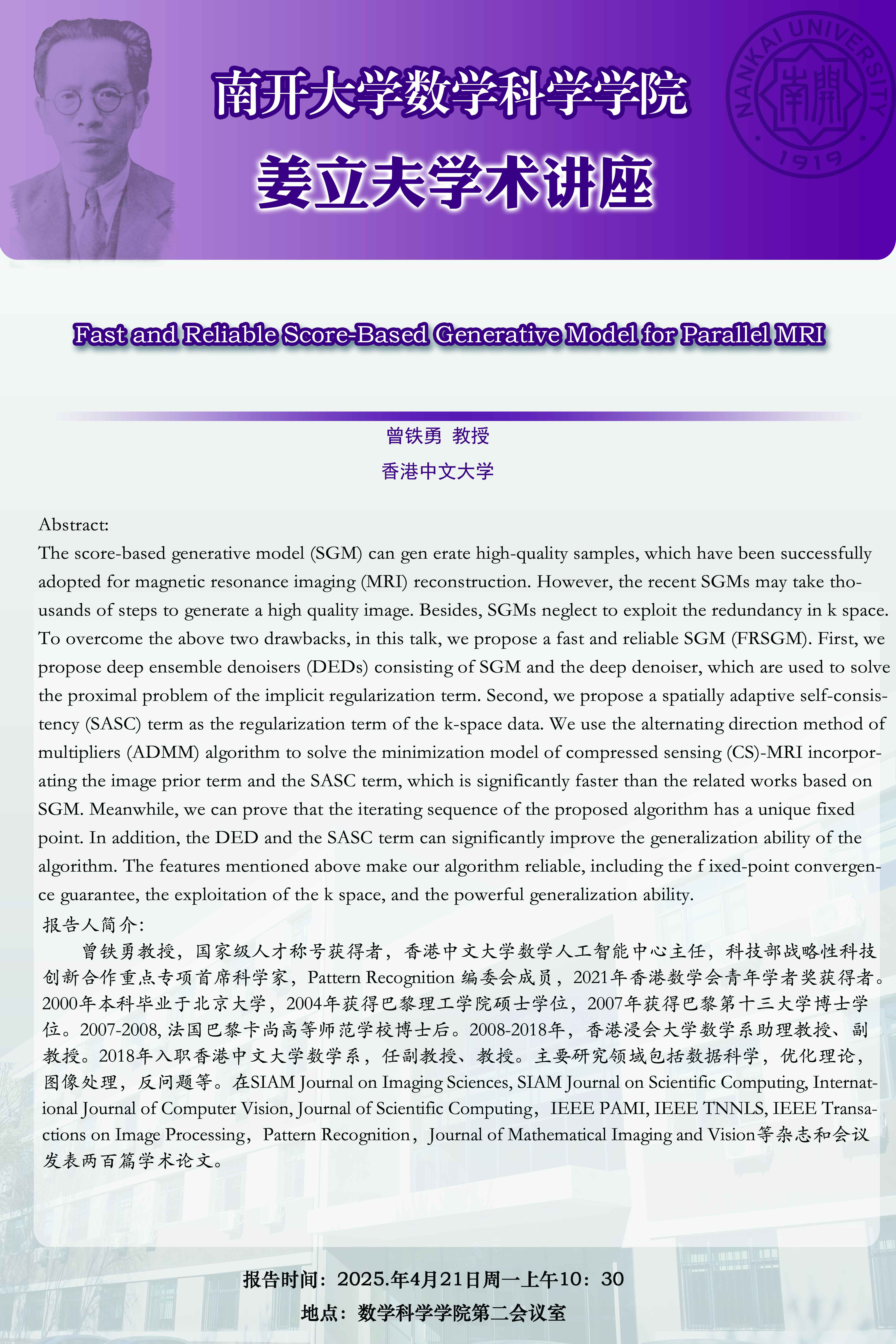 【姜立夫学术讲座】Fast and Reliable Score-Based Generative Model for Parallel MRI