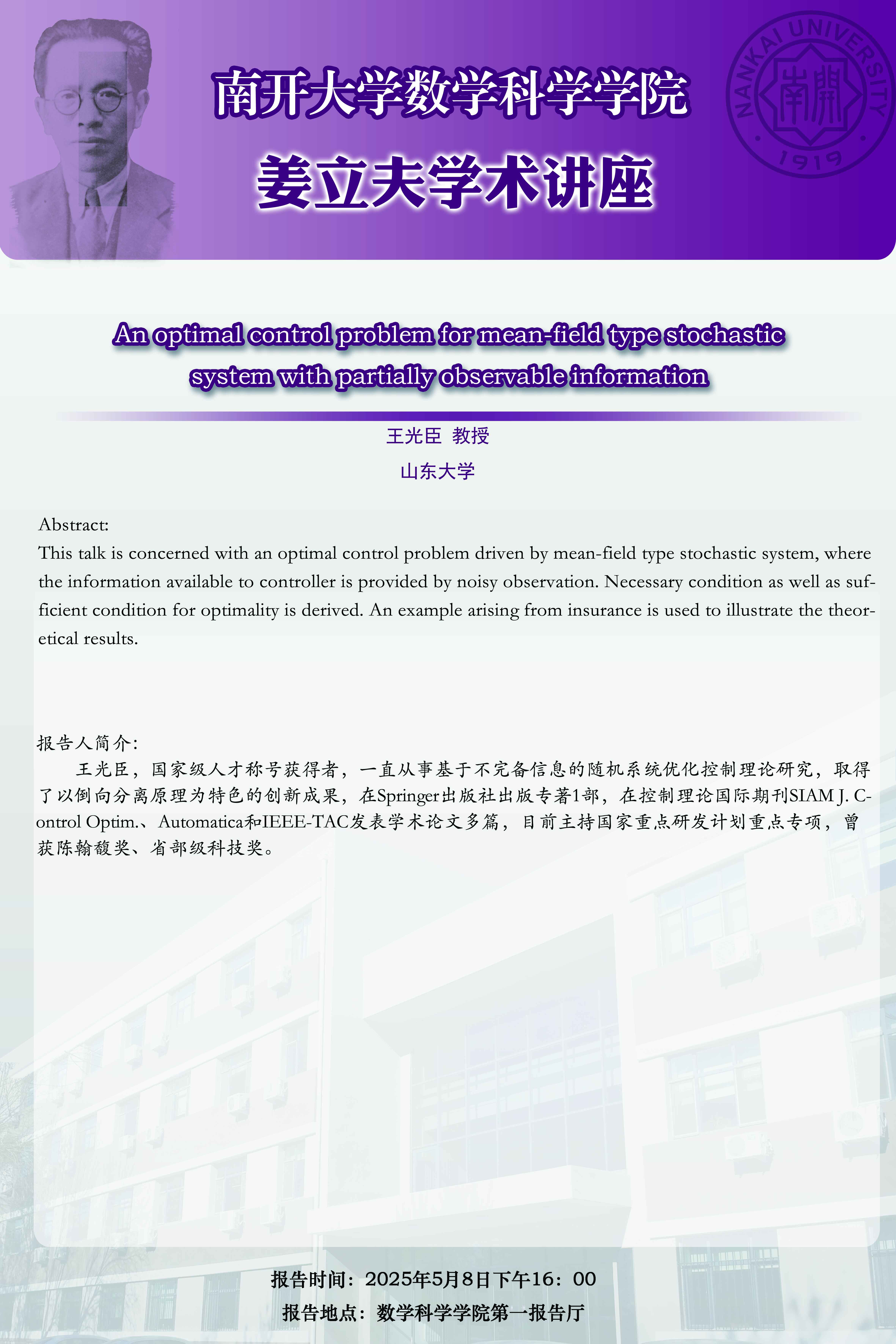 【姜立夫学术讲座】An optimal control problem for mean-field type stochastic system with partially observable information
