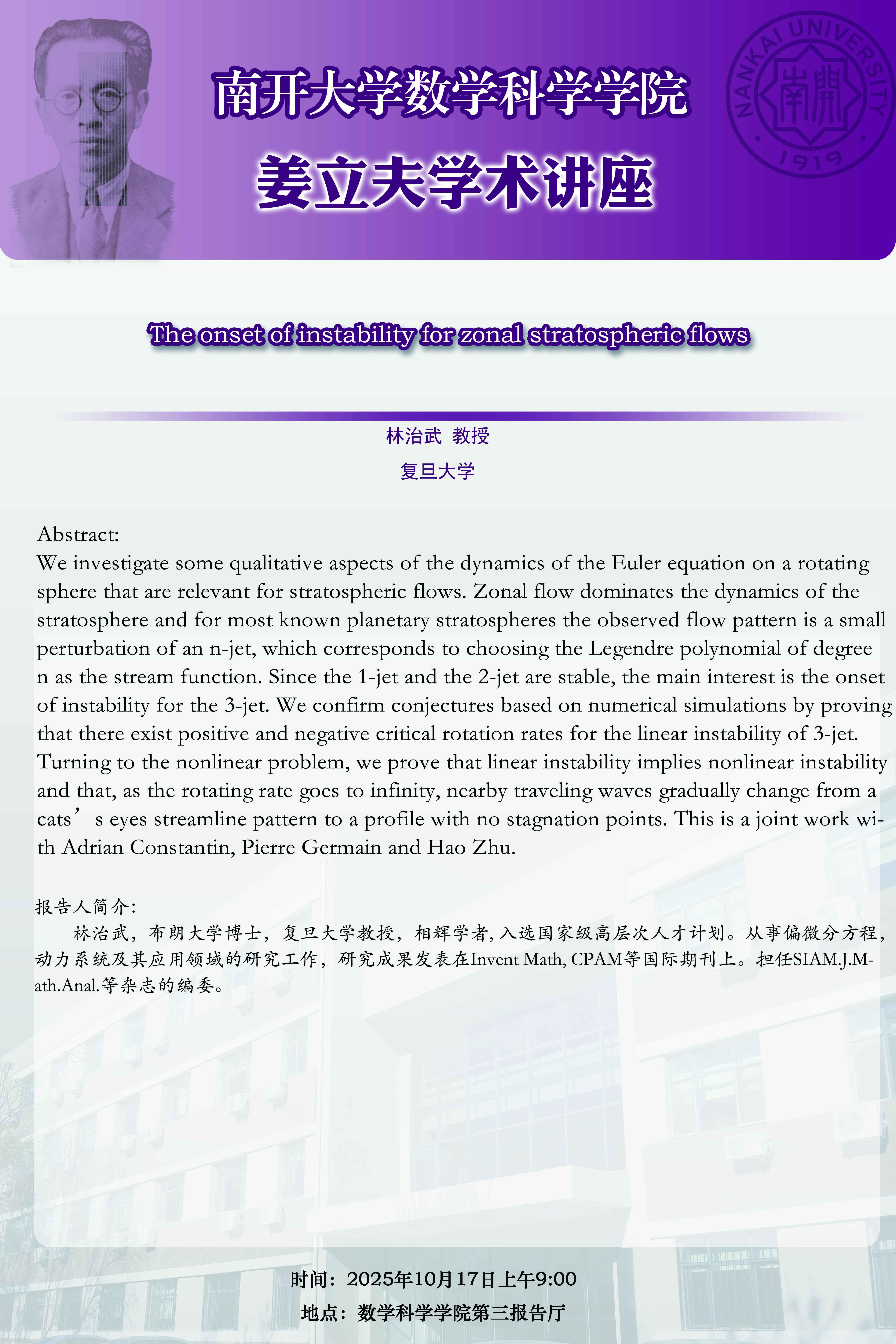 【姜立夫学术讲座】The onset of instability for zonal stratospheric flows