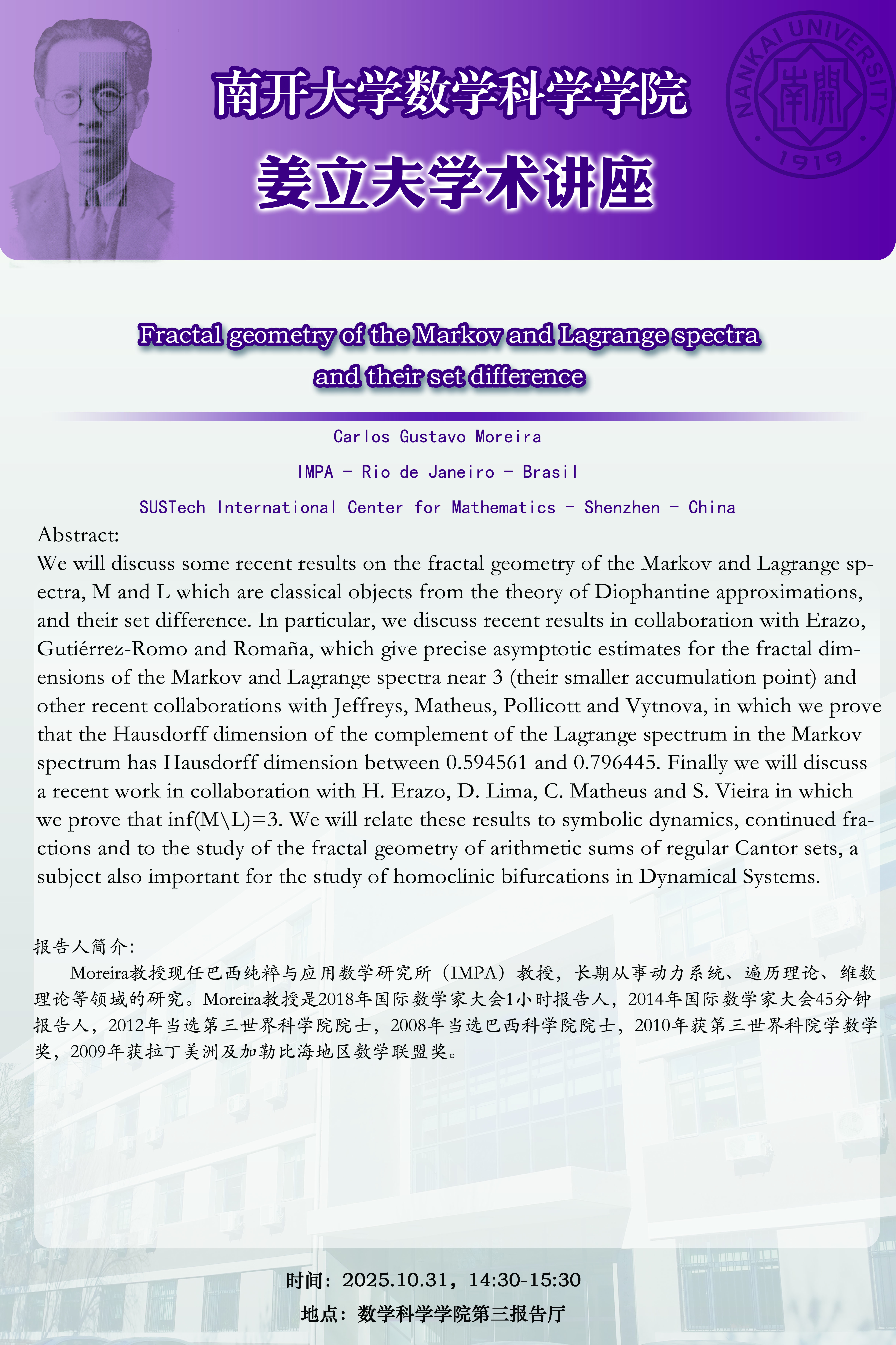 【姜立夫学术讲座】Fractal geometry of the Markov and Lagrange spectra and their set difference